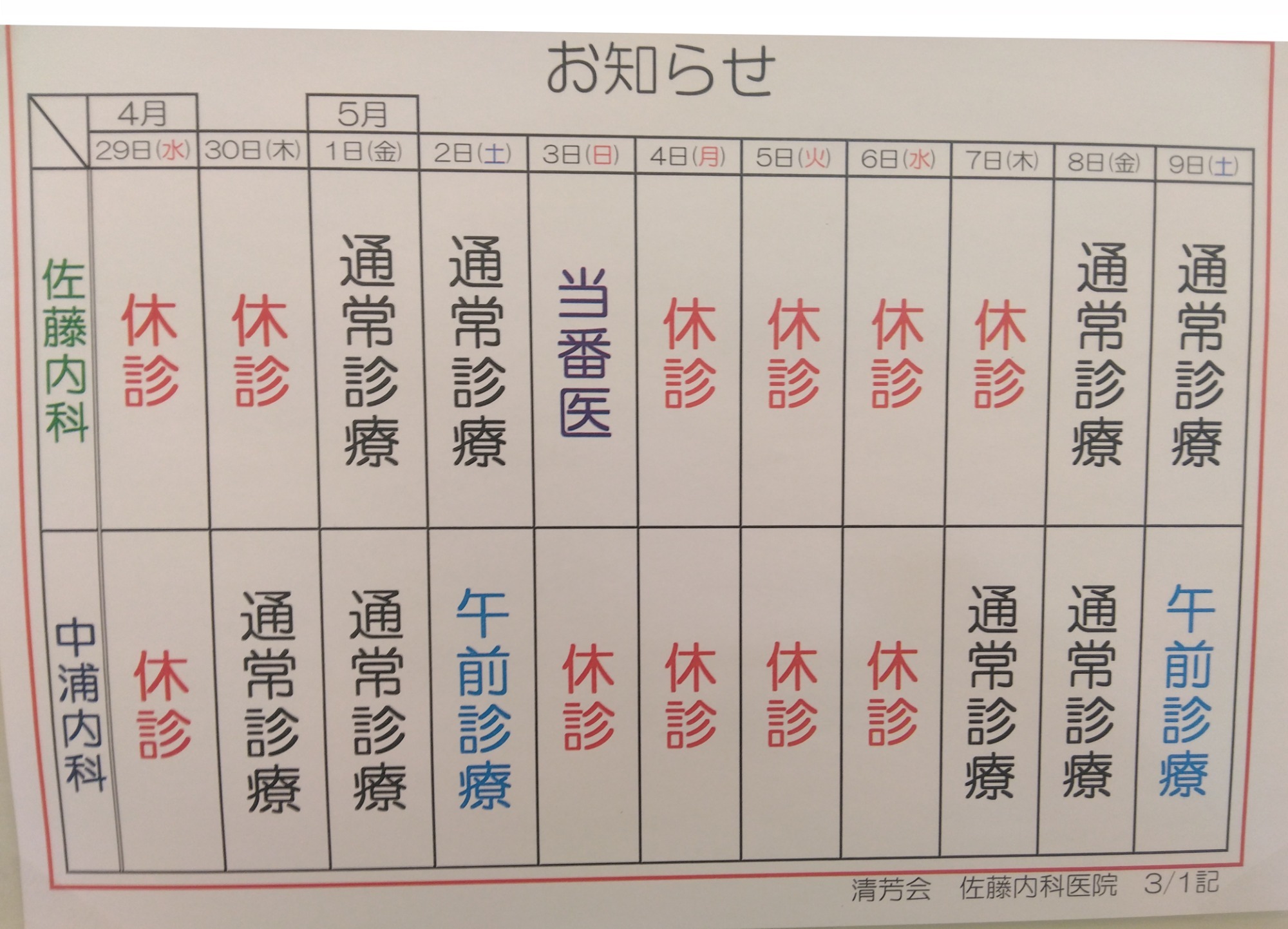 3/27(金)佐藤文彦Dr ⇒ AM 佐藤清寿Dr ・ PM 佐藤清寿Dr